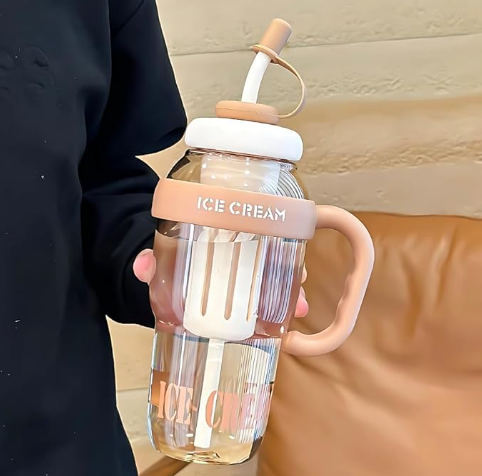 1300ml Ice Cream Print Water Bottle with Straw & Handle, Leak-Proof, BPA-Free, Insulated Transparent Gym & Sports Tumbler for Kids & Adults, Travel & Outdoor Use, Pack of 1 (Beige)