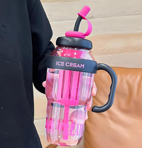 1300ml Insulated Transparent Gym Tumbler Water Bottle with Locked Straw & Carry Handle | Ice Cream Print Leak-Proof BPA-Free Sports Hydration Shaker Travel Cup Pink Black 1 (Pink+Black)